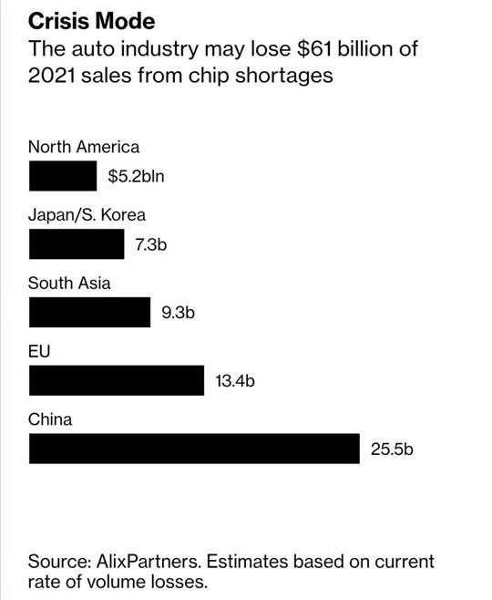 “半导体短缺预计将导致汽车制造商损失610亿美元的销售额”,这是彭博引用艾睿铂分析给出的最新预测数值,围绕半导体芯片短缺给汽车行业带来的损失,用最新汇率换算,610亿美元大约相当于人民币3,925亿元,粗略统计就是营业收入和销售额将因为“芯荒”减少接近四千亿元。