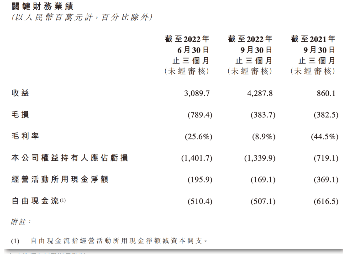 三季报显示,公司报告期内营收42.88亿元,同比增长398.5%;但净亏损13.4亿元,与去年同期的净亏损7.19亿元相比,几近翻倍。三季度研发开支4.04亿元,毛利率-8.9%,经营活动所用现金净额1.69亿元,截至9月30日,零跑汽车现金及现金等价物、受限制现金、按公允价值计入损益的金融资产及长期银行定期存款结余约为117.79亿元。