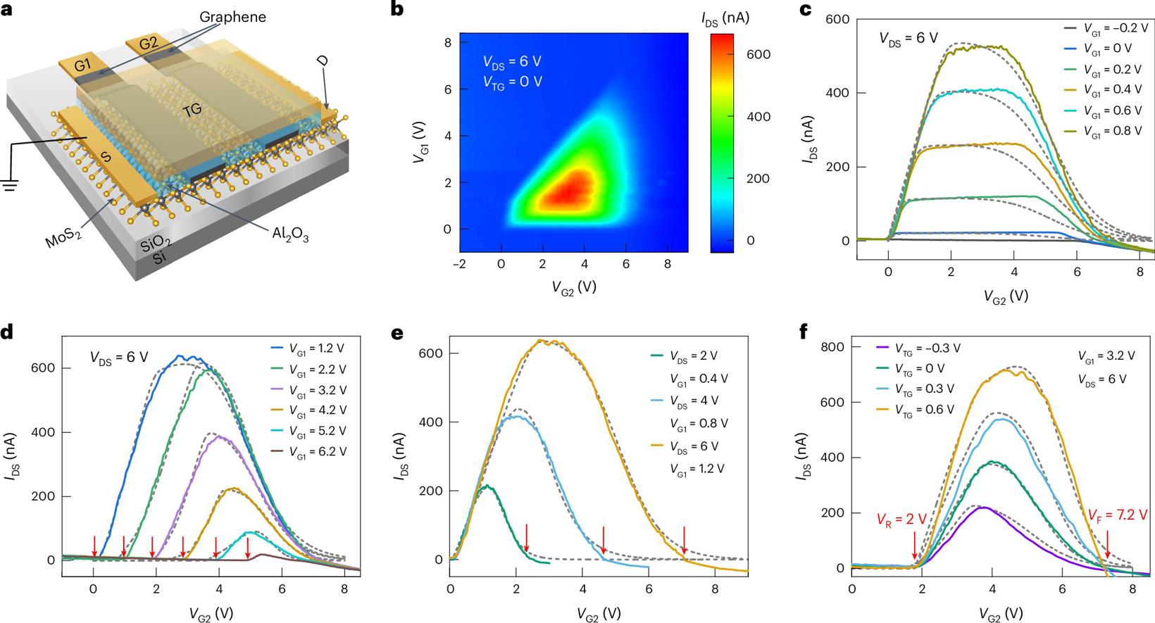 “范德华界面结晶体管(vdW-IJT)建立在MoS2同质结上,不同区域的载流子浓度不同,表现出由多个石墨烯栅极端子控制的电流放大或分裂行为,”该论文的第一作者Hefei Liu解释说。“它的主要优势是能够在单个器件内固有地生成高斯(Gaussian)或π形成员函数,而传统的CMOS技术需要数十个晶体管才能实现这一点。因此,vdW-IJT可以实现更紧凑、更节能的成员函数发生器。”