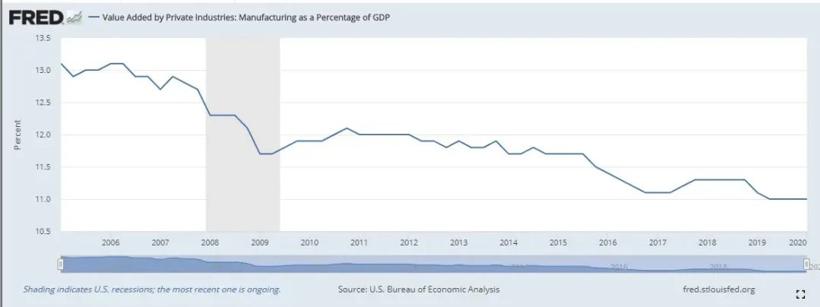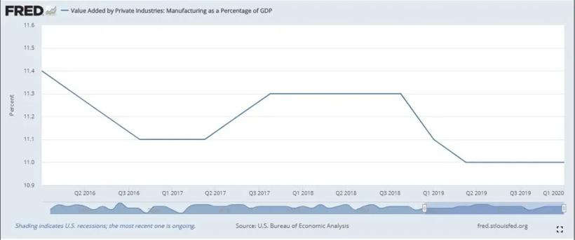 也正因为如此,其实特朗普任期内美国制造业占据GDP的份额并没有得到实质性提高,2017年第二季度到2019年第一季度表现最好,也仅仅增长0.2个百分点,从11.1%提高到11.3%,此后又滑坡到11.0%;反而是金融服务业的贡献度继续高歌猛进。
