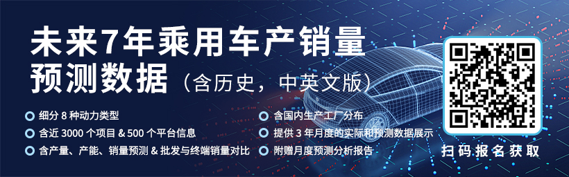 《未来7年乘用车产销量预测数据》(含历史,中英文版):细分8种动力类型;近3000个项目&500个平台信息;产量、产能、销量预测&批发与终端销量对比;含国内生产工厂分布;提供3年月度的实际和预测数据展示;附赠月度预测分析报告等。获取方式如下: